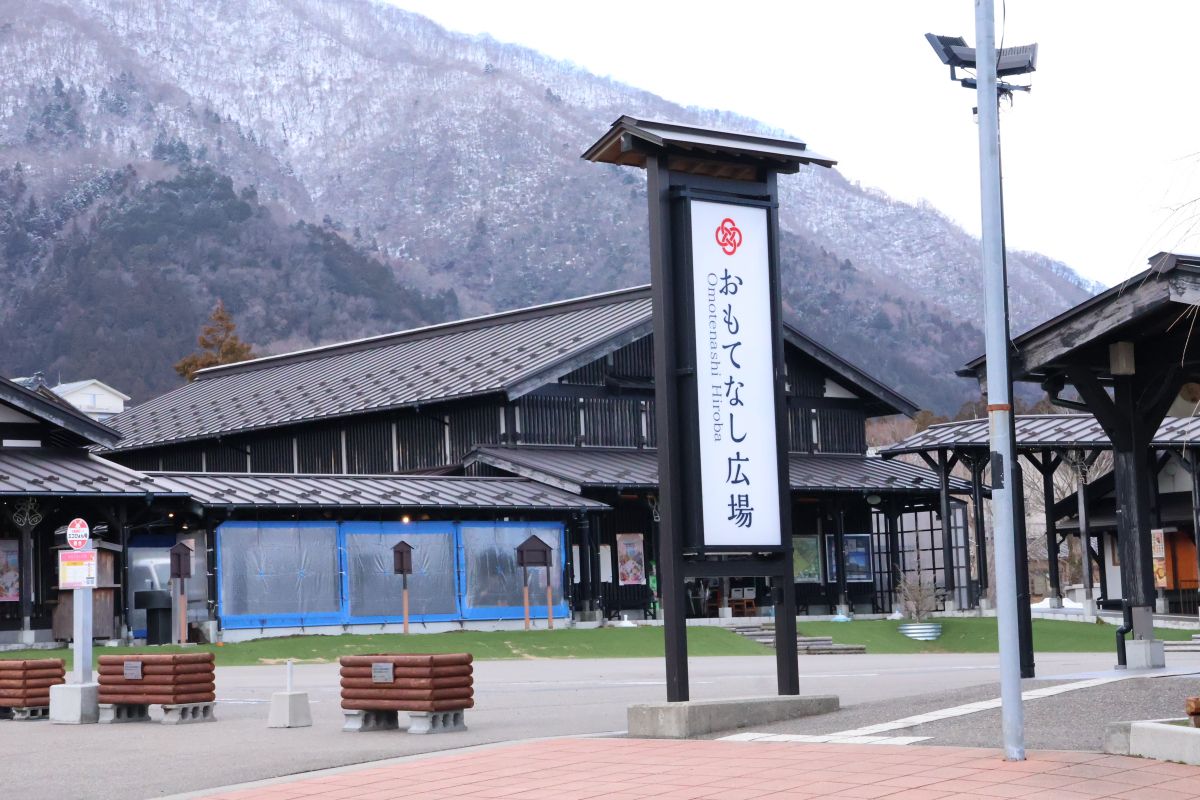 駅から歩くこと5分、おもてなし広場に到着しました。温泉街のほぼ中心に位置し、フードコートや弥彦ならではのスイーツ販売、農産物直売所があります。