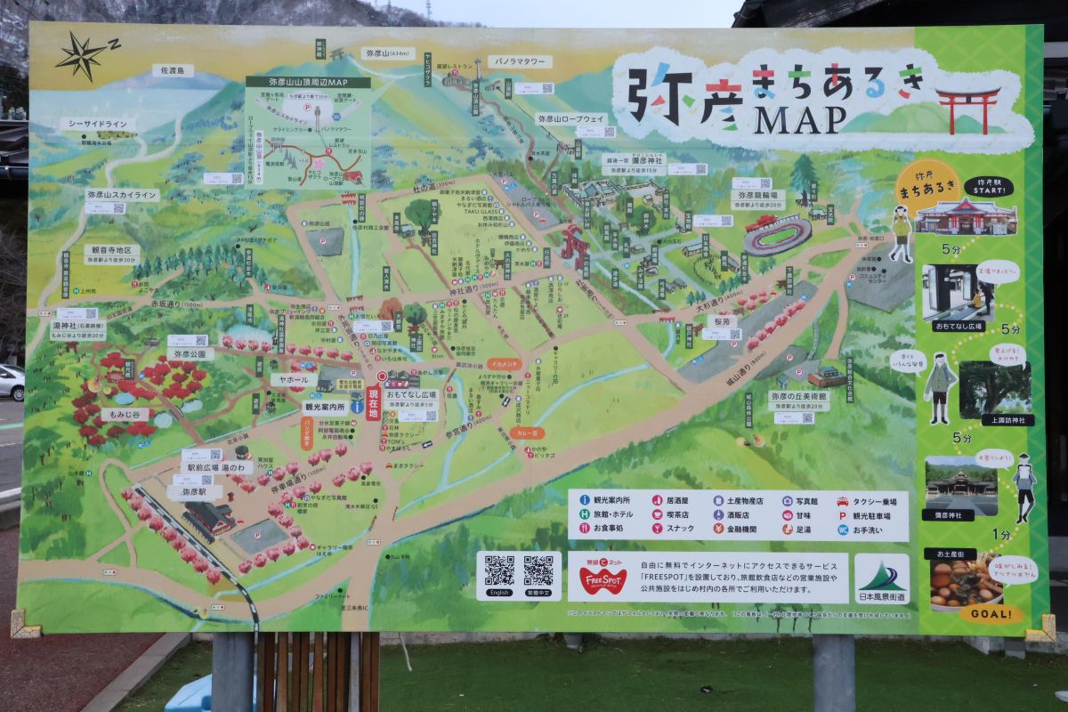 弥彦温泉は徒歩で巡れるコンパクトにまとまった温泉街のため、散策しやすいエリアです。