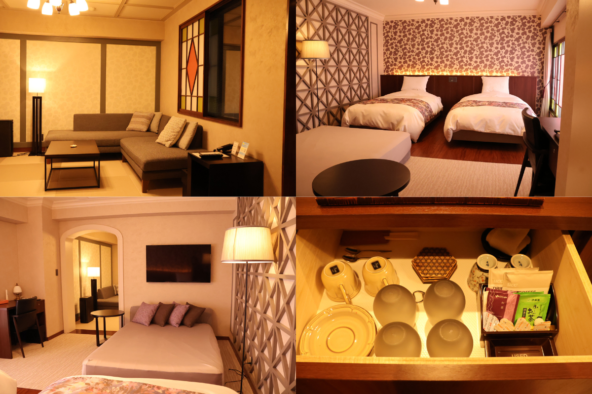 今回わたしが宿泊した602号室は、和洋折衷の空間が絶妙な室内でした。大正浪漫を思わせる雰囲気がありながら、ベッドはシモンズ社製、リビングのソファはゆったりとくつろげる広さでバランスが心地よく、滞在時間を快適に過ごせました。