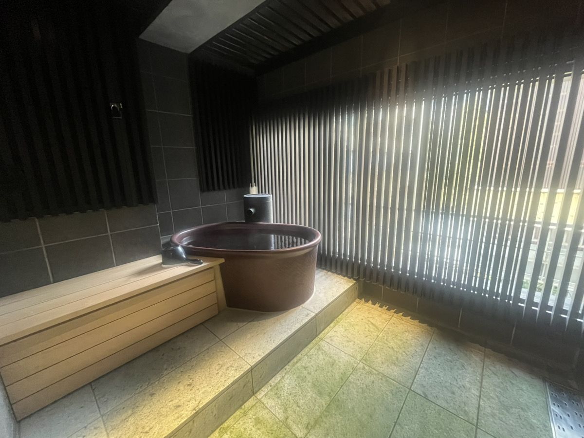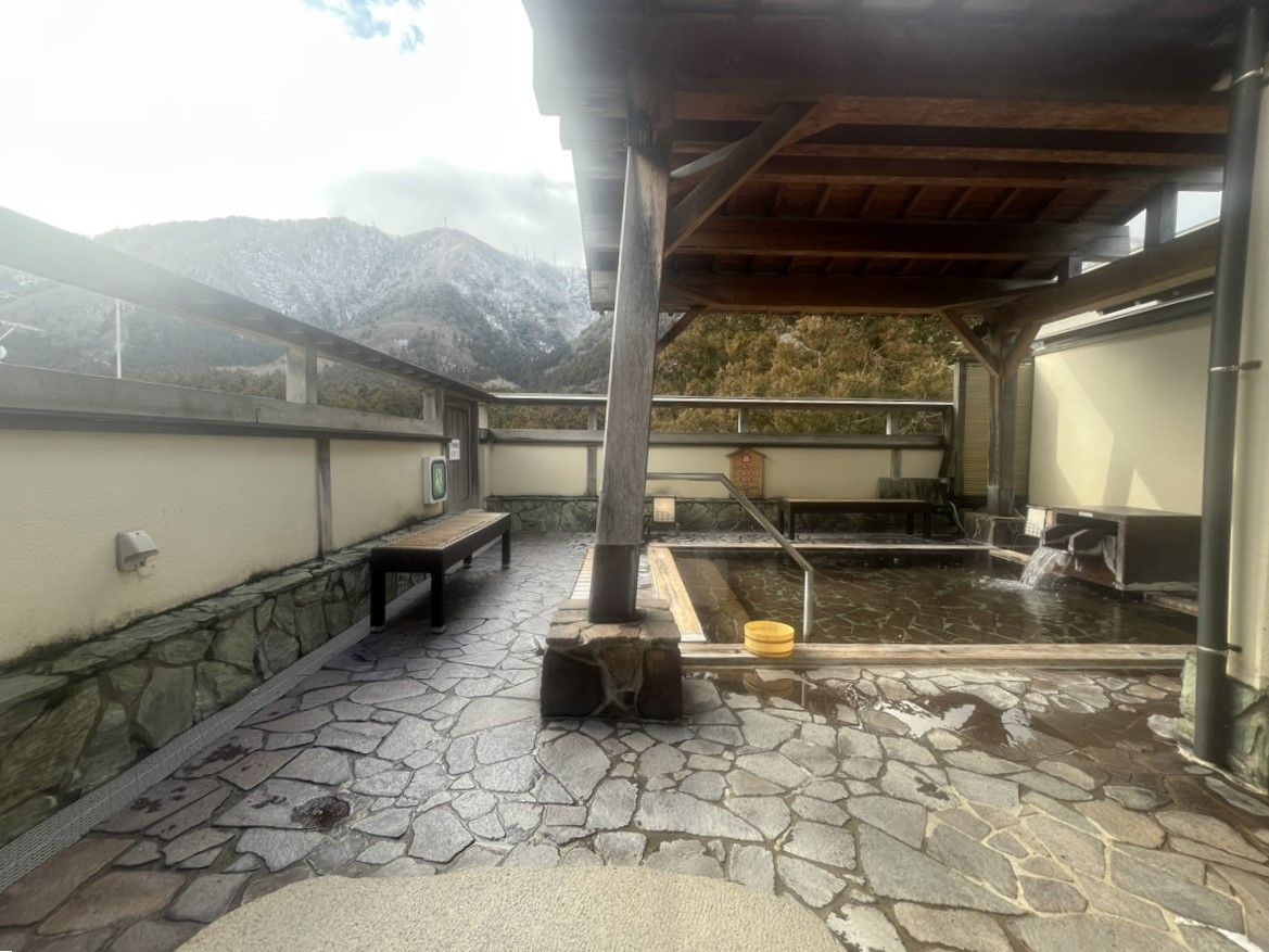 源泉露天風呂はこちら。洗い場はシャワー室のみですが室内にあるため、共同風呂が苦手な方でも充分源泉風呂を楽しめます。