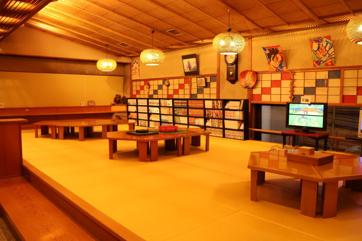 程よい温度の源泉で温まったあとは、少しだけ館内を散策しました。1階にある「だんらん亭」では畳に寝転がりながら豊富なコミックスを読んだり、将棋や昔懐かしいファミコンなどで遊んだりできます。