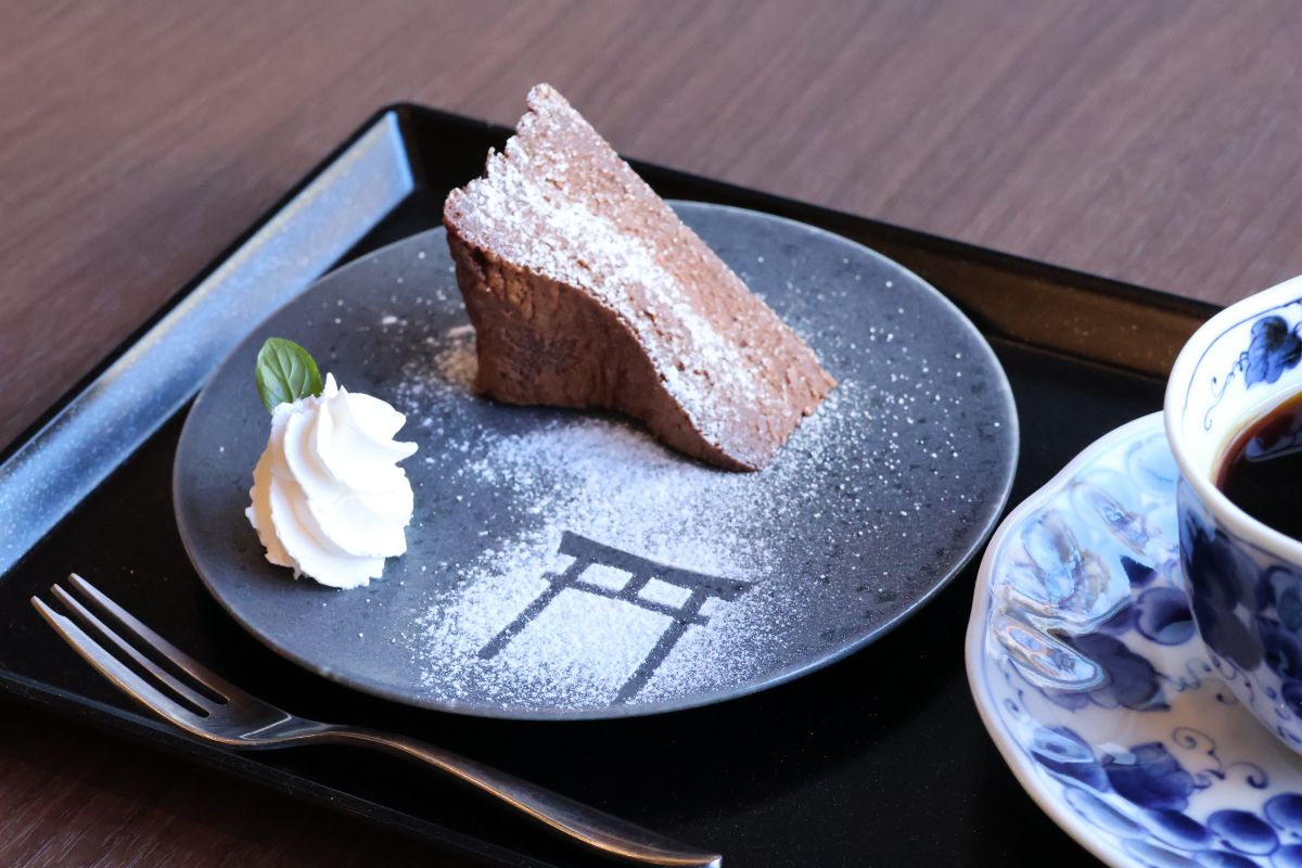 弥彦山を望む鳥居をイメージした、期間限定のガトーショコラ(税込500円)。生チョコみたいに濃厚なのに、くどく感じない美味しさでいくらでも食べられそう。珈琲は燕市の「ツバメコーヒー」監修で、オリジナルブレンドのものを提供しています。