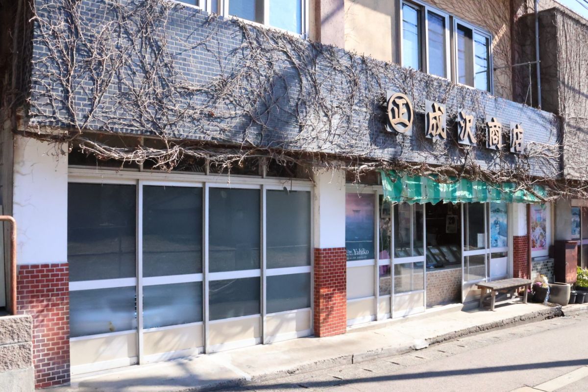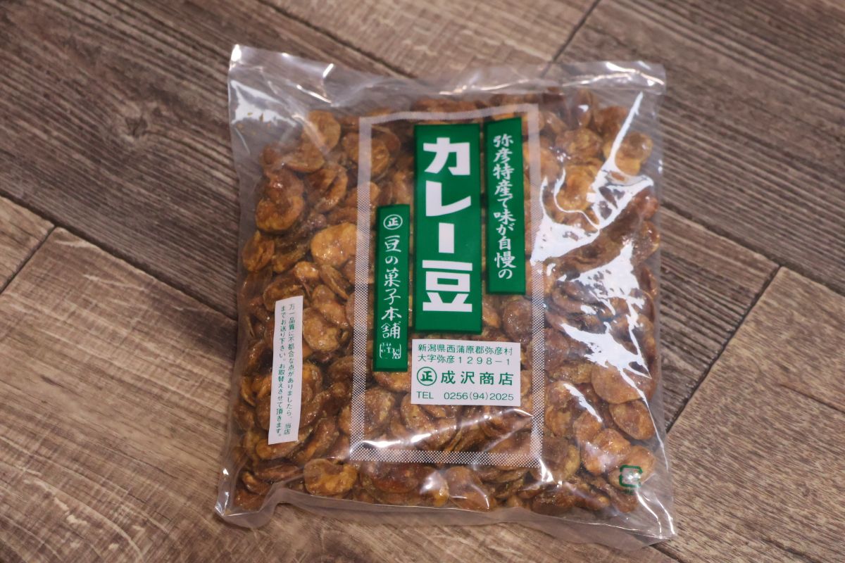 みのやから歩いて5分の場所にある成沢商店さん。レトロな外観が目を引くこちらでは、香ばしくてスパイシー、ひと口食べたらなぜか止まらなくなる弥彦村の定番おやつ「カレー豆」(500円)が購入できます。