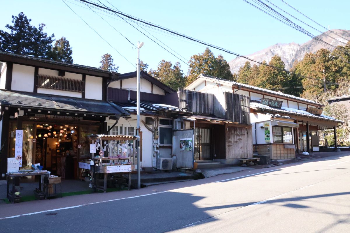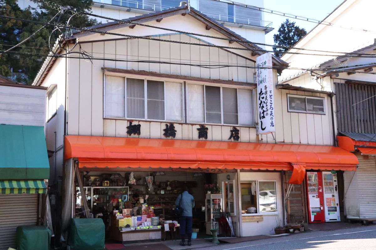成沢商店から彌彦神社方面に戻り、一の鳥居の手前を左に曲がって駐車場の方に向かうとお土産屋やお団子屋、蕎麦屋など老舗のお店が並ぶ通りに出ます。