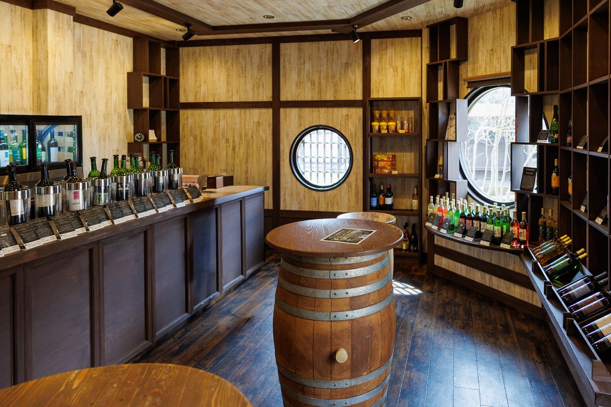 店内がワイン樽を思わせる内装というのも印象的。ワイン樽といえば、試飲用のテーブルは実際の樽をリメイクしたものが使われているのも注目ポイントです。
