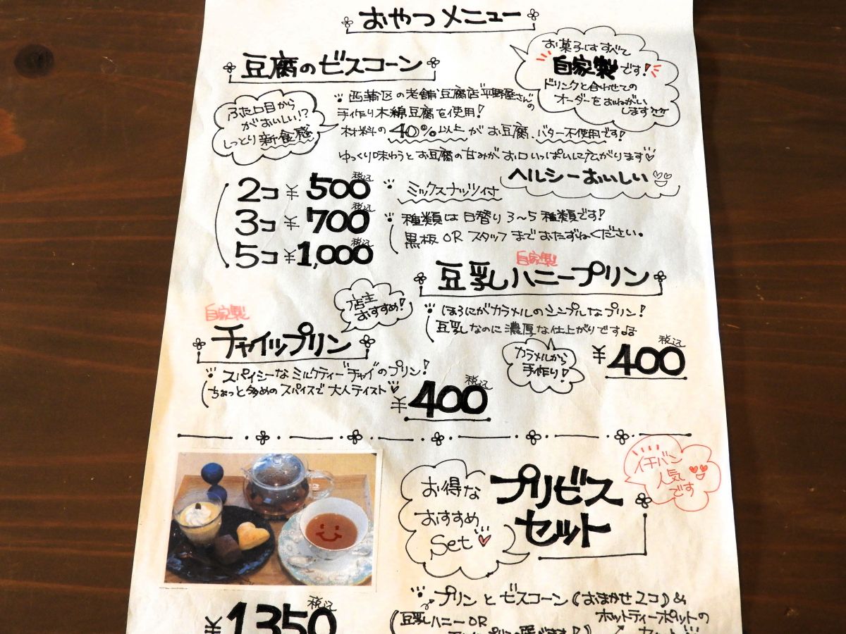 「おやつメニュー」は豆腐のビスコーン(各種)とチャイップリン、豆乳ハニープリンの3種。