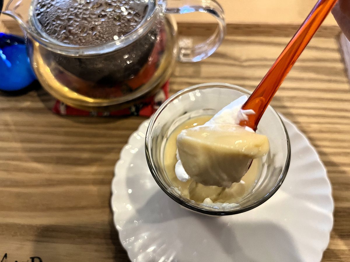 「チャイのプリンは最初から出したいと思っていました。理由は他に出しているお店がなかったから。あと、自家製ブレンドのスパイスチャイを豆乳で煮だして、シンプルに卵と作っています。豆乳ハニープリンのキャラメルも自分で作りたくて何十回も焦がしながら練習しました」