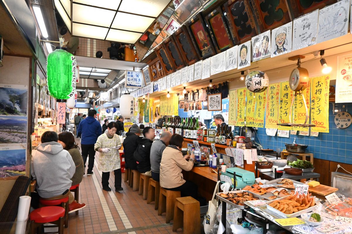 続いては、もう一軒の鮮魚店「新潟本町 鈴木鮮魚」へ。こちらも鮮魚の販売はもちろん、その場で魚料理や一杯を楽しめる、にぎわいの絶えない人気店です。朝9時から営業しているので、朝食や少し早めの昼食にもぴったり。
