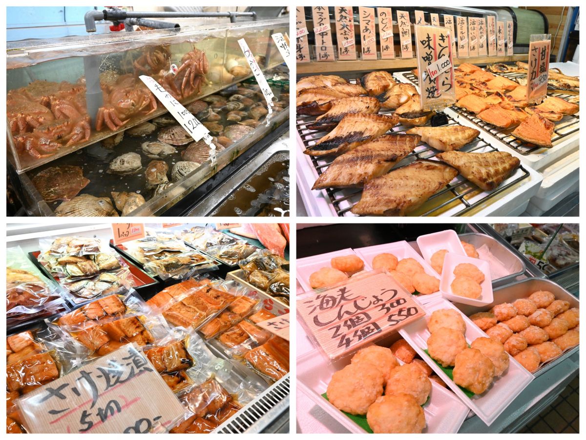 店先には、焼き魚や煮魚、本ズワイカニ、岩ガキなど日本海のごちそうがずらり。女将さんの明るい声に迎えられ、思わず立ち寄りたくなるのが「古川鮮魚(ふるかわせんぎょ)」です。(おねえさんと言われてうれしい中年の筆者)