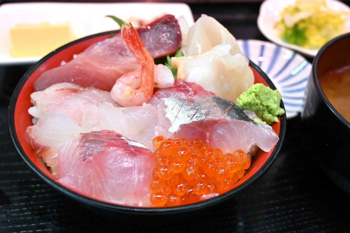 さぁ、登場したのは「海鮮丼A」1,800円。その日の仕入れにより内容は異なり、10種類前後の旬の魚介が丼いっぱいに盛り込まれています。県産コシヒカリを使った酢飯と、厚切りの刺身との相性は抜群。小鉢と味噌汁も付き、満足感たっぷりです。