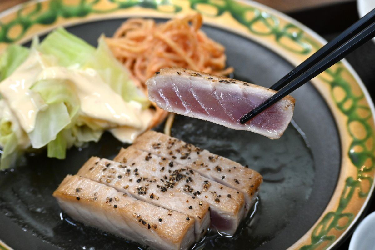 刺身でも十分においしいまぐろの表面だけに焼き目をつけ、中はしっとりレアに仕上げています。そこへ、柑橘のダイダイを加えて手作りしたポン酢ベースの特製タレを。和食の技法と洋食の感性を融合したような一皿は、まるでレストランのクオリティ!