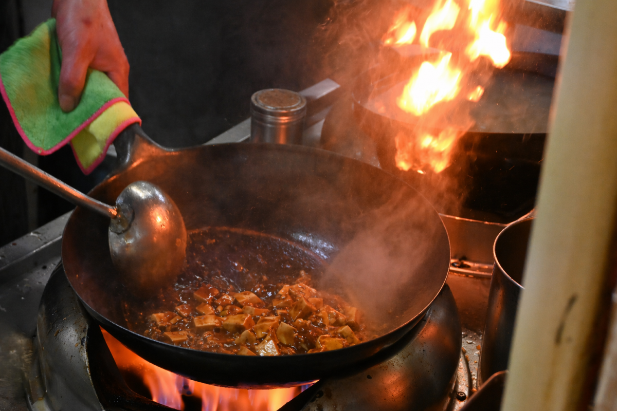 おいしさの決め手は、こだわり抜いた特製の醤(ジャン)にありました。ピーシェン豆板醤をはじめ、中国のものから日本の味噌まで、7種類の味噌を独自にブレンドしているそうです。さらにラー油も自家製で、すべての調味料を合わせ、一晩寝かせてから使うことで、味に一体感と深みを生みだしているのだとか。そして、調理の際には高火力でしっかり炒め、味噌の香りと油を引き出します。