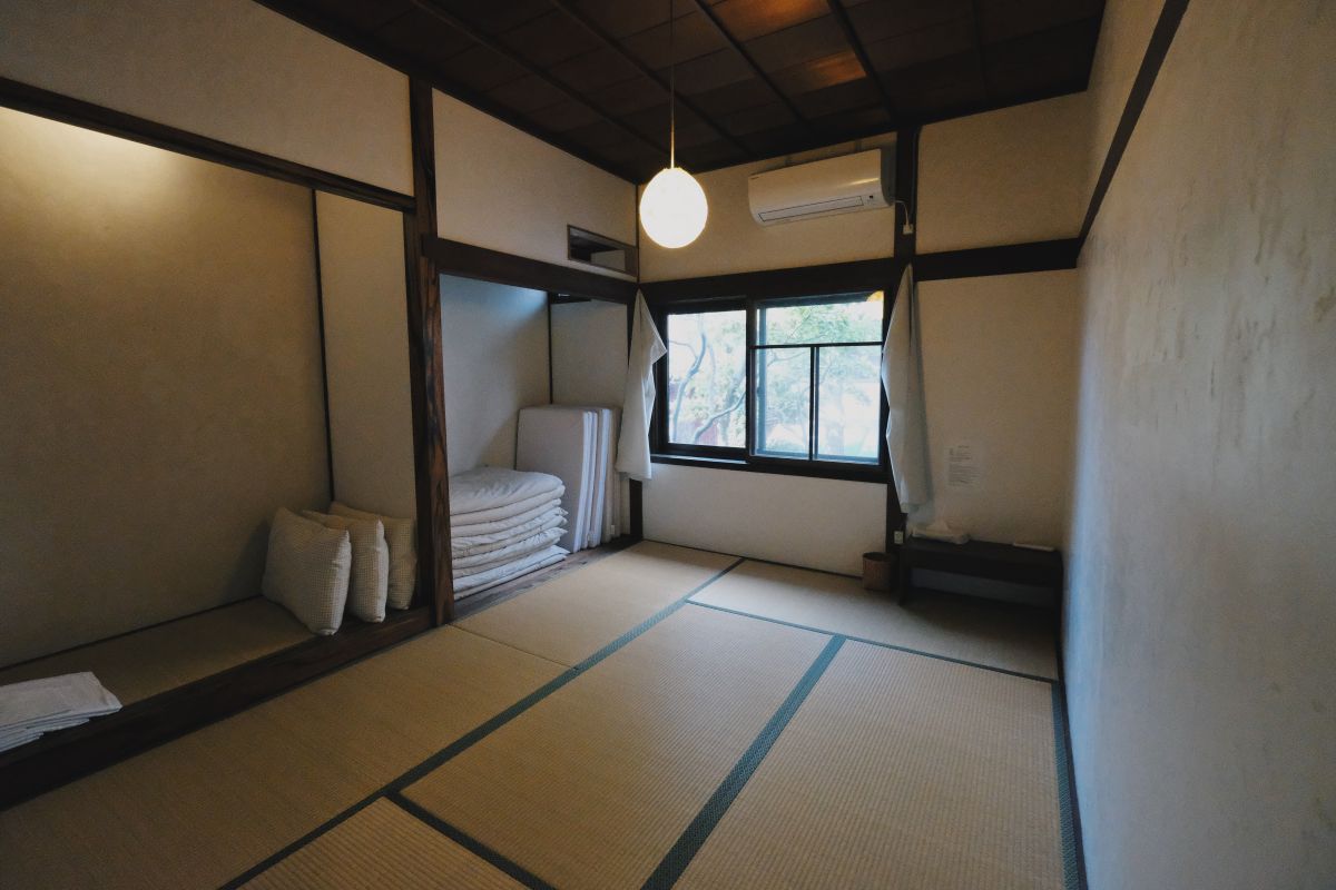 手続きが終わったら、スタッフさんに共有のキッチンやトイレ、シャワー室、お部屋を案内してもらいます。部屋は、すべて木造りでドミトリーの「Hae」、「Kochi」、個室の「Ogi」、「Ibuki」4種類。それぞれ特徴のある部屋ですが、今回はダブルベットのある個室「Ogi」(税込5,500円/1名)に泊まらせてもらいました。