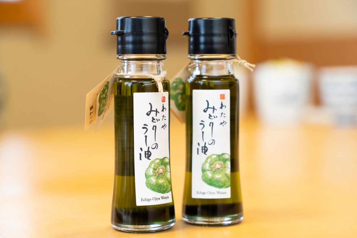 こちらはわたやさんが開発したみどりのラー油をかけていただきます。小千谷市の特産野菜かぐら南蛮(青唐辛子)から色と辛味を取り出したというシロモノです。ではこちらもすすってみましょう。