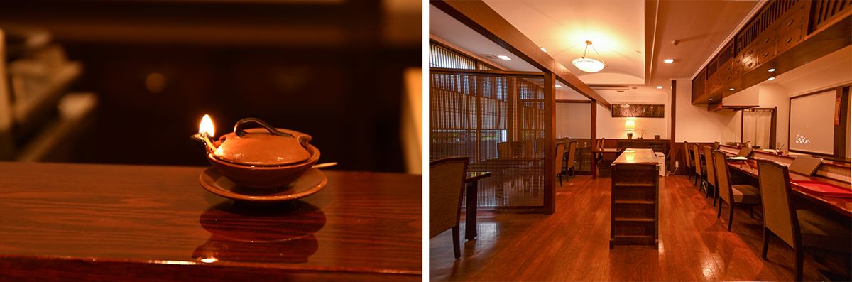 店内は、所々に灯明皿(とうみょうざら)の優しい明かりが揺れる落ち着いた空間。