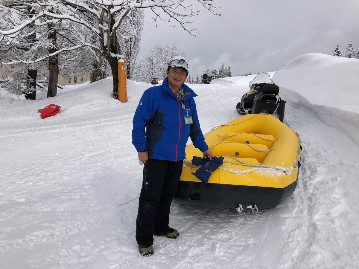 次はスノーモービルに引っ張られて雪上コースを周遊する「トロールラフティング」。
