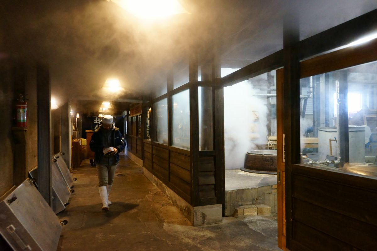 もくもくと立ち上る蒸した米の蒸気、そしてもくもくと入れ代わり立ち代わり樽を運ぶ職人さんたち……。