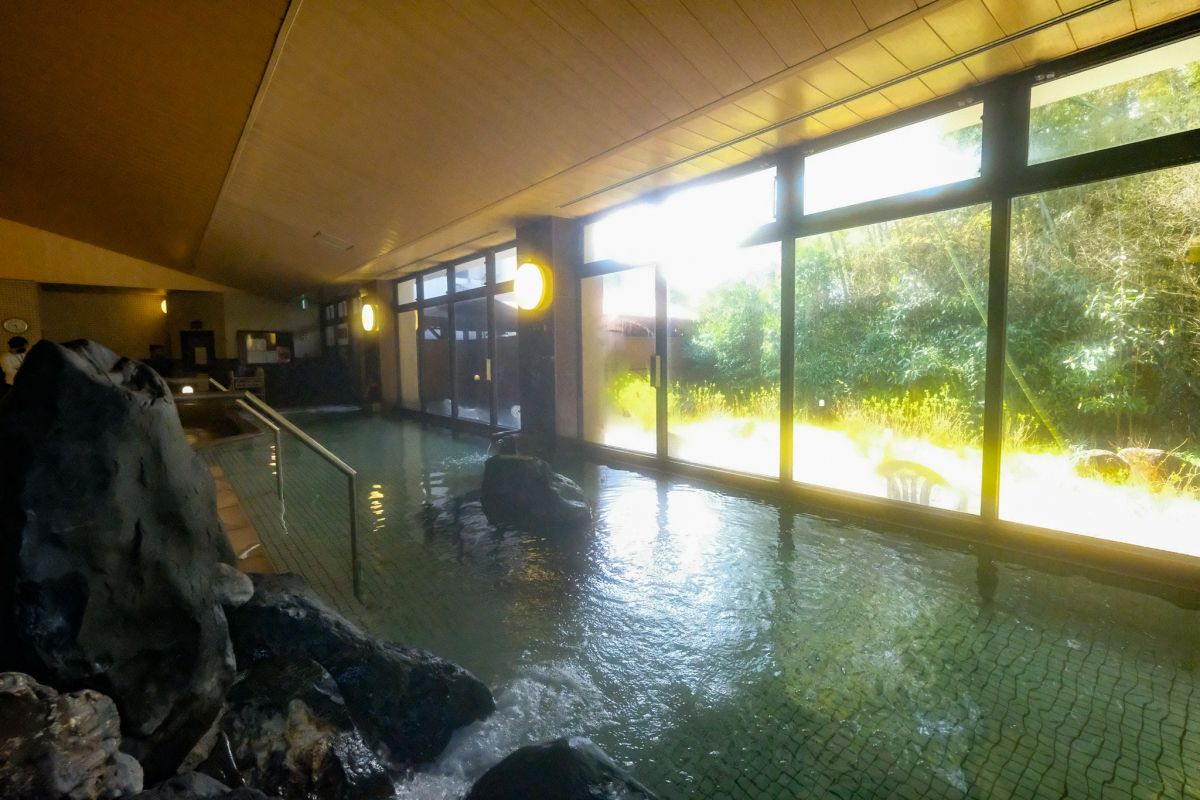 この日最初に向かったのは、源氏の湯内にある「森のサウナ」。浴室の扉を開けるとかなりゆったりと過ごせそうな大きな内風呂が目に入りますが、今回はその先にあるフィンランド式サウナの「森のサウナ」へと急ぎます。