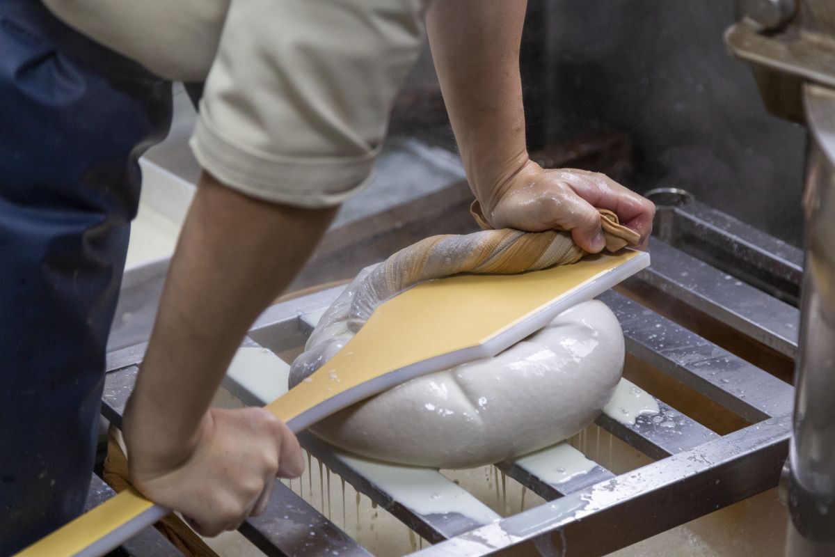 こうして出来上がった豆乳ににがりを加えて混ぜるとおぼろ豆腐になります。機械化が進んだ今、このように手作業で行っているところはかなり少ないそうです。「その日の気温や湿度などによって仕上がりが変わるため、毎日微妙に調整しながら作業しています」と佐藤さん。