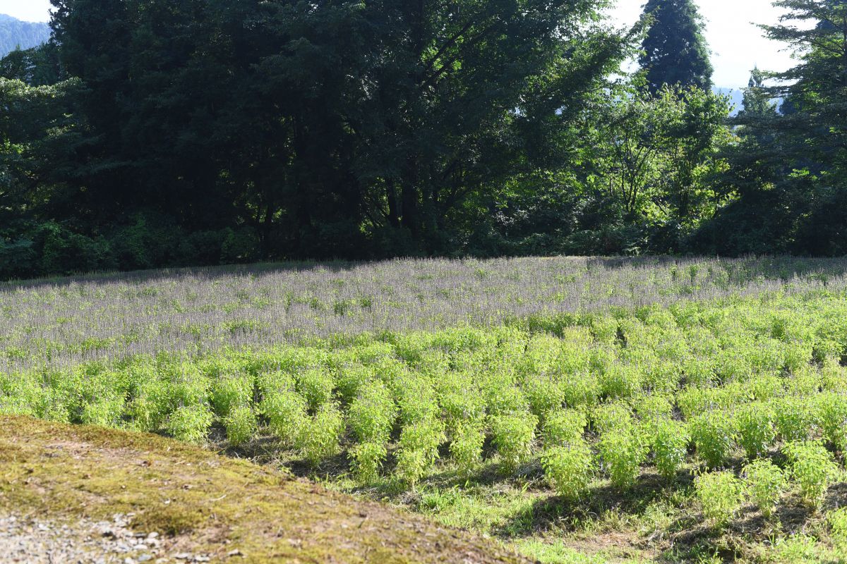 宿から5分ほどバスを走らせたら到着! 里山にあるホーリーバジル畑「まつのやま茶倉」で花摘みを体験します。