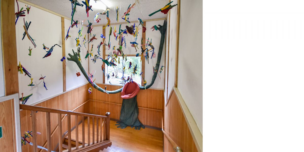 真田小が廃校になった2005年、最後の在校生だったユカ・ユウキ・ケンタと、学校オバケたちが登場するというストーリーで、各教室には流木のオブジェや木の実を使った作品が展示されています。