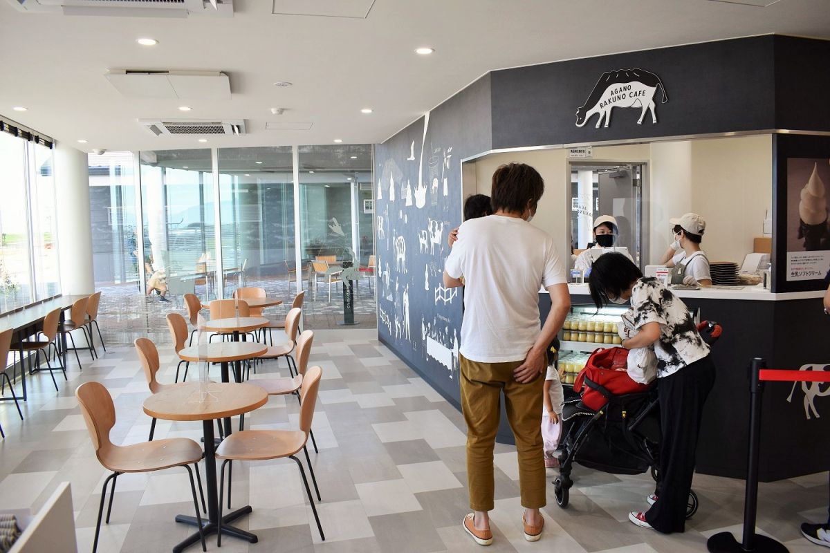「あがの酪農カフェ」では、オープン以来一番人気だという「生乳ソフトクリーム」(税込350円)をいただきました。黒いコーンが印象的なソフトクリームですがさっぱりしていて食べやすかったです。でも、しっかりミルク感あって美味しい。