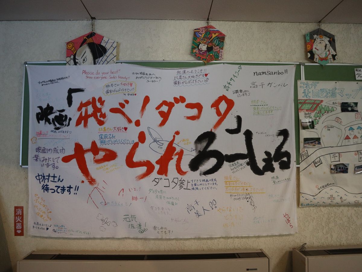 「佐渡市役所相川支所高千連絡所」のホールには、映画公開を記念した展示が今も飾られています。