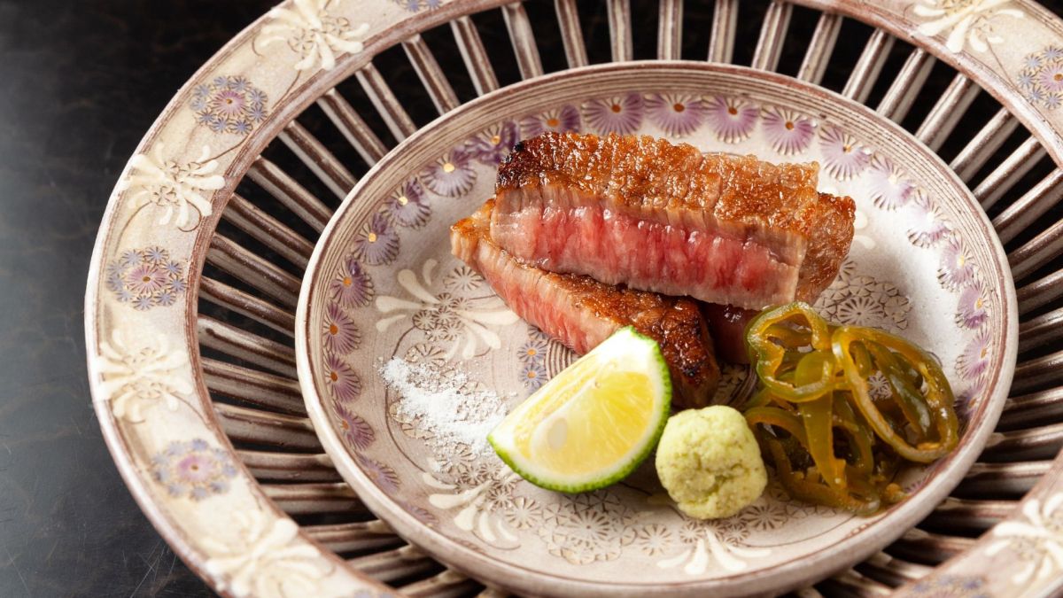 牛が小さい頃食べていた牧草で燻製した新発田牛の炭火焼に、新発田の甘長唐辛子の醤油漬けを添えた。