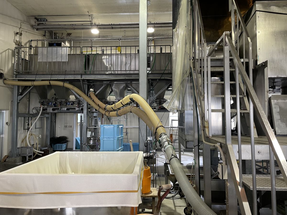 右にある大きな蒸米機で、精米され浸漬後の酒米を蒸し、中央に流れているエアーシューターで蒸された後に酒米を次の工程の別室へ送ります。