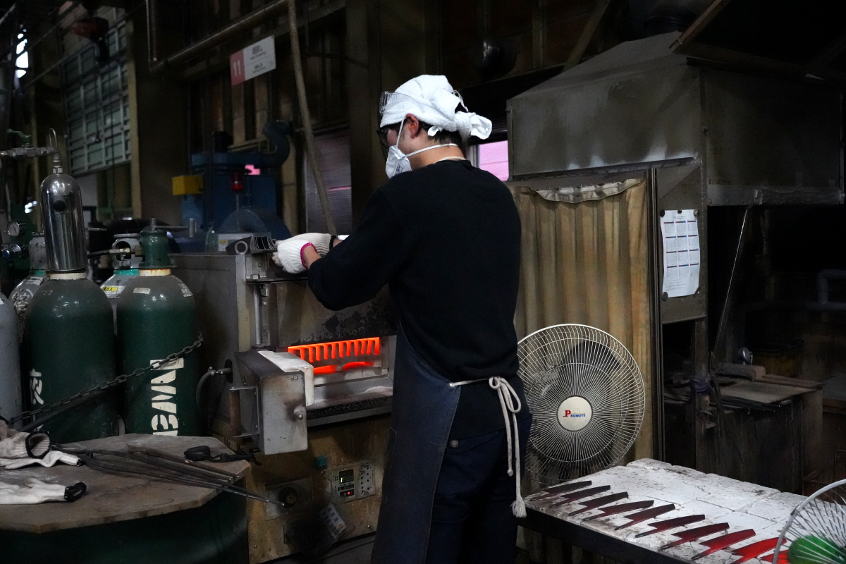 薄暗〜い空間に、赤くぼんやり光る“包丁”を発見。硬度を高める「焼入れ」作業中の包丁でした。工場内は職人さんたちが集中しやすいように、常に薄暗くしているのだとか。
