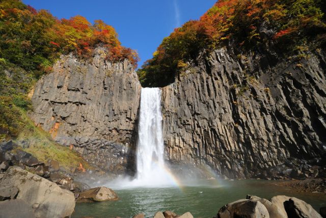 日本の滝百選の一つに選ばれている苗名滝。落差55m、水しぶきを上げて落ちるさまは迫力満点!特に人気のシーズンは雪解けの水が大量に流れ込む見応え抜群の春と色づく周囲の景色が美しい秋の紅葉の季節です。また、涼しさを感じられる夏もおすすめです。