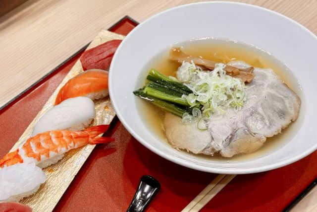 「あさっぱラーメン」と寿司のセットが人気。市場内だからこそ味わえる新鮮なネタを楽しんで。