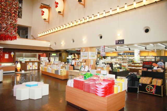 そば、コシヒカリ、笹だんごなど新潟土産の定番品の他、十日町の生地工芸品や地域の特色ある産品も豊富です。また、フロアには雪国越後三大つるし雛の一つであり、「最多の手作り詰め物人形展示物」としてギネス世界記録に認定された「幸せを呼ぶ傘つるし雛」がディスプレイされています。なんとその数1万1655個。圧倒的なスケールのつるし雛もお楽しみいただけます。