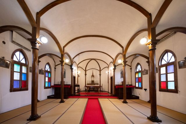 設計は京都「聖ザビエル天主堂」(現・明治村移築)「鶴岡カトリック教会 天主堂」など、当時多くの教会建築を手がけたパピノ神父によるもの。歴史的建造物として貴重なだけでなく、畳敷きの和洋折衷の空間がかわいらしい教会で趣があります。