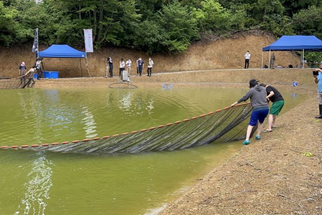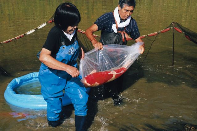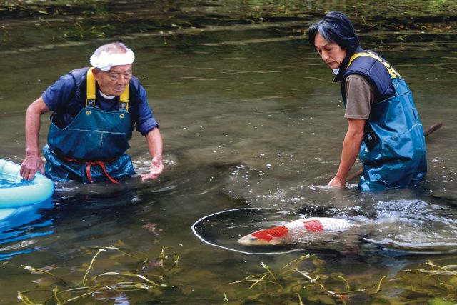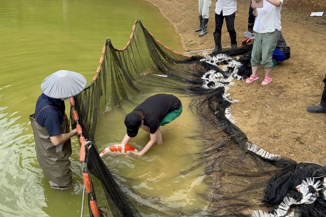紅白や金、黒赤などさまざまな色と模様をもつ、迫力のある姿が魅力的な錦鯉。毎年、山古志にある野池に、地元養鯉業者が丹念に育てた錦鯉たちが放たれます。錦鯉ふれあい体験では、鯉師さながら素手や網を使って鯉を捕まえて、専用の容器に移していきます。スタッフによる丁寧なアドバイスを聞きながら挑戦できるので、初めてでも安心。泳ぐ宝石ともいわれる錦鯉に触れることのできる貴重な体験です。