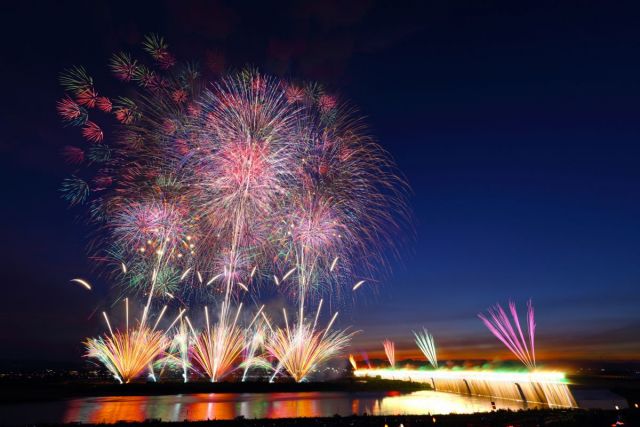 昭和20年(1945年)の長岡空襲をきっかけに、慰霊と復興を願うために始まった日本を代表する花火大会。越後三大花火のうち、「川の長岡」と謳われているのがこの「長岡まつり大花火大会」です。信濃川の両岸から観覧することができ、夜空に打ち上げられる鮮やかな花火は人びとを圧倒します。とくに「正三尺玉」や「復興祈願花火フェニックス」と呼ばれる大型花火は、夜空を埋め尽くすほどの壮大な花火で迫力満点。長岡の観光やご当地グルメなども楽しみながら、お祭りを満喫しましょう。