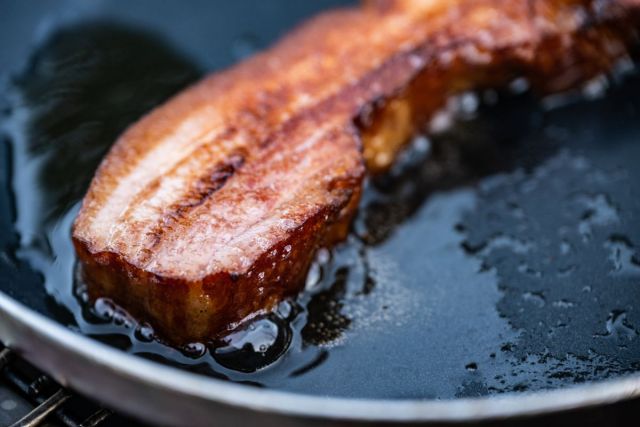 ベーコンはブロックのままこんがりと焦げ目をつけて。ベーコンからは甘い脂が溢れてくるので、そのまま季節の野菜を一緒に焼いていただきましょう。