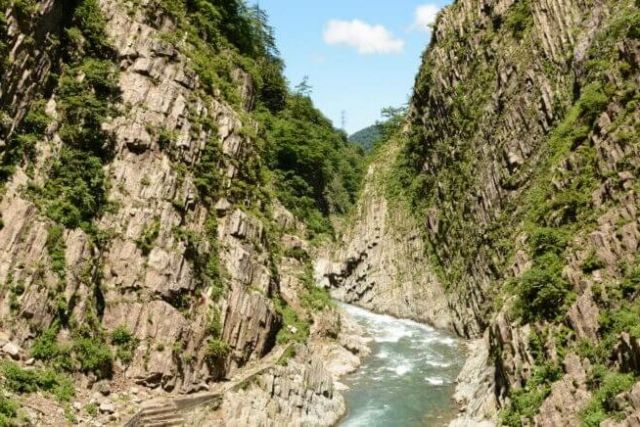 黒部峡谷・大杉谷と並ぶ日本三大峡谷のひとつ「清津峡」。柱状節理の岩壁がそびえるV字形の大峡谷は、国の名勝・天然記念物に指定される圧巻の景観です。