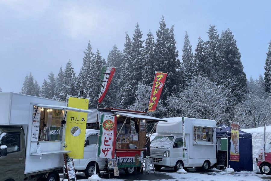 雪の滑り台やスノーモービル体験など、スノーアクティビティが盛りだくさん。また、『トチオノアカリ』が、趣のある古民家を照らします。夜には、ゆきあかりに囲まれた幻想的な会場で、雪上花火を楽しめます。