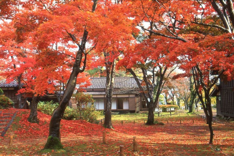 明治時代の大地主、髙橋家の別荘として建築造園されたもみじ園には、樹齢150年~200年のカエデやツツジなどが園内を彩ります。夕暮れからは園内がライトアップされ、昼間とは違った幻想的な夜のもみじが楽しめます。