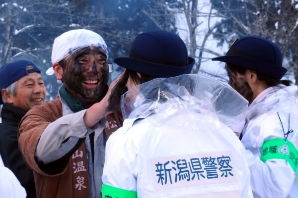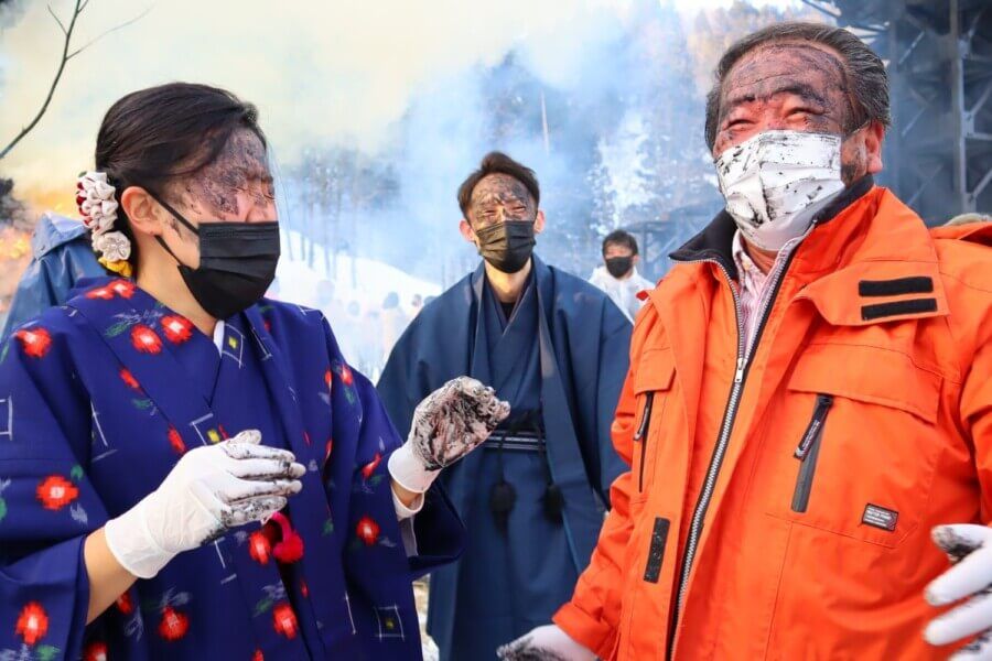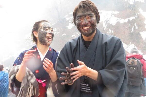 すみ塗りは「賽の神」という神事(別名・どんど焼きとも言う)の灰と雪を混ぜ、お互いの顔に「おめでとう」と言いながら塗りあう、無病息災・家業繁栄を願う小正月行事。温泉があるからこそ続いてきた行事であるといえる。