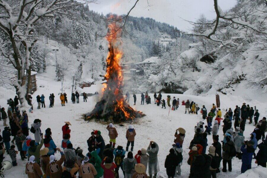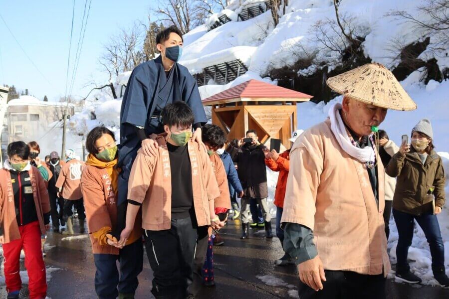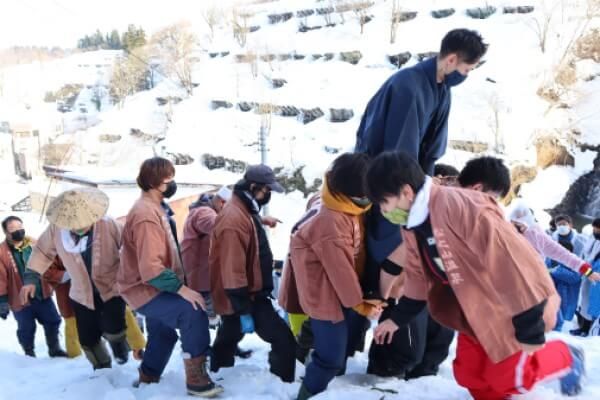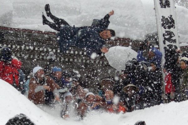松之山温泉で毎年1月15日に開催される小正月の伝統行事。前年に結婚した初婿を薬師堂の高さ5メートル程ある境内から雪の斜面へ投げ落とします。