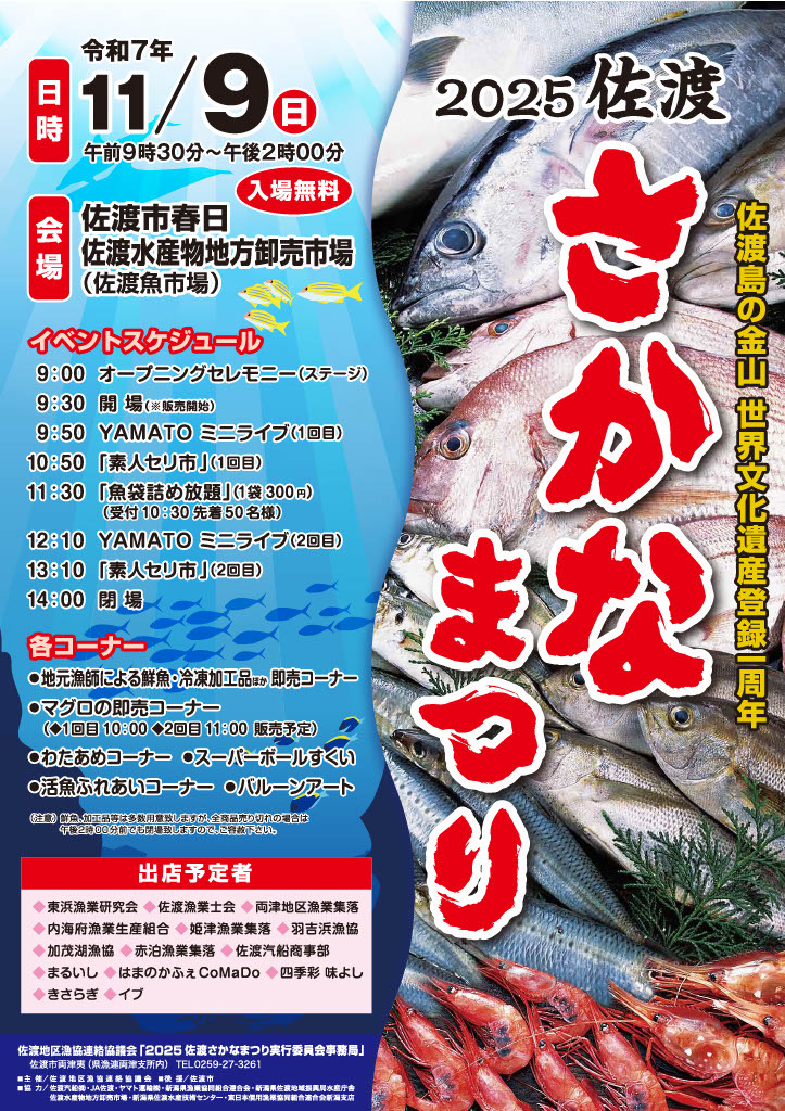 魚袋詰め放題、素人セリ市のイベントや地元漁師の鮮魚・加工品販売コーナーやマグロの即売コーナーなど佐渡のさかなが佐渡魚市場に大集合!!