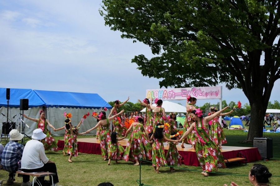 こくえいえちごきゅうりょうこうえん「あろはかーにばるすぷりんぐ!」新緑の中、ウクレレ演奏、フラダンス、タヒチアンダンスなどのハワイアンステージをお楽しみください。