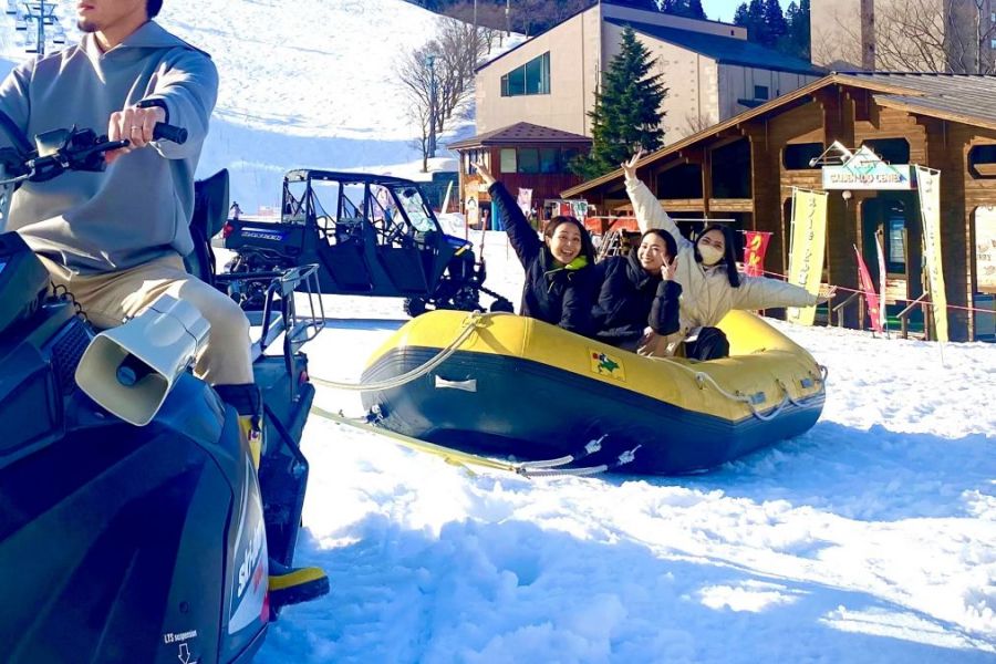 すのーらふてぃんぐ/なすぱすきーがーでんスノーモービルに引かれたラフトボートで、雪上をぐるぐる回るスノーラフティング!遠心力を活かしたスリリングな旋回が魅力で、笑い声が絶えない人気体験です。