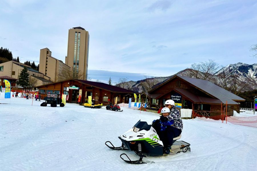 苗場スキー場では、パパやママが運転手になって雪の上を自由に走れるスノーモービル体験を楽しめます。