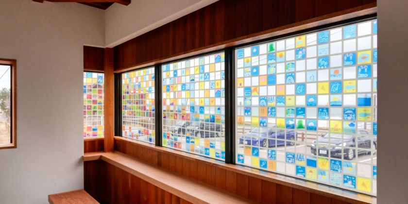 「ゆうひ」の待合室では、地元小学校の子供たちによるイラストをステンドグラスのように窓にデザイン。この窓から見る日本海の夕日がキレイだそうです。