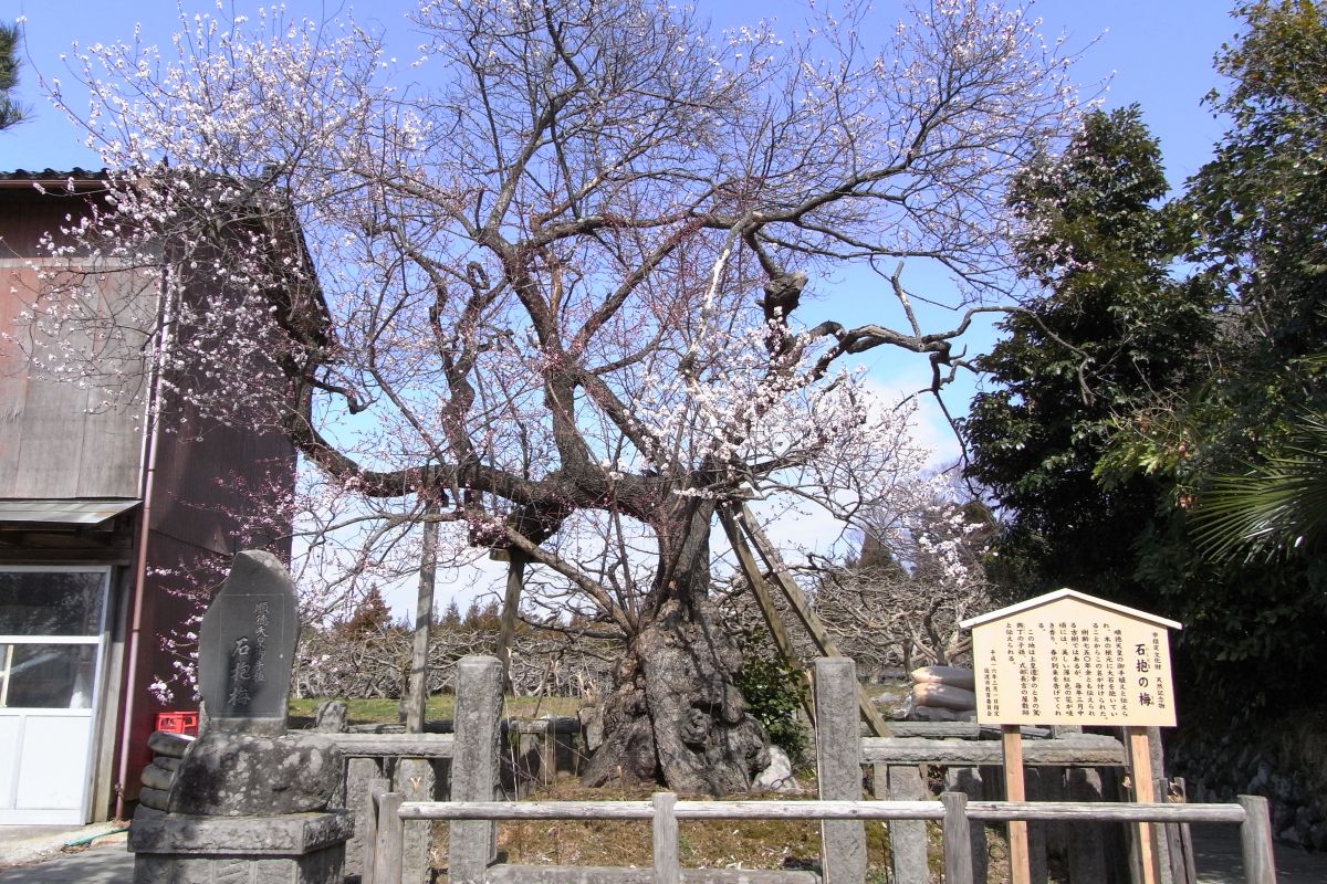 佐渡市指定記念物の石抱の梅は、佐渡市真野地区、真野御陵へと向かう海抜約52メートルの段丘上に立つ梅の古木です。樹高約7.7メートル、幹囲約3.5メートル、樹齢はおよそ750年以上と伝えられており、根元で大きな石を抱えるような姿から「石抱の梅」と呼ばれています。1221年に佐渡へ配流された順徳上皇の御手植えと伝えられ、この地は上皇遷幸の際、駕籠を担いだ式部氏の屋敷があった場所ともいわれています。枝の一部に枯れや幹の傷跡を残しながらも樹勢は今なお旺盛で、薄紅色の美しい花を咲かせ、訪れる人々に佐渡の春の訪れを告げています。開花時期は3月中頃。