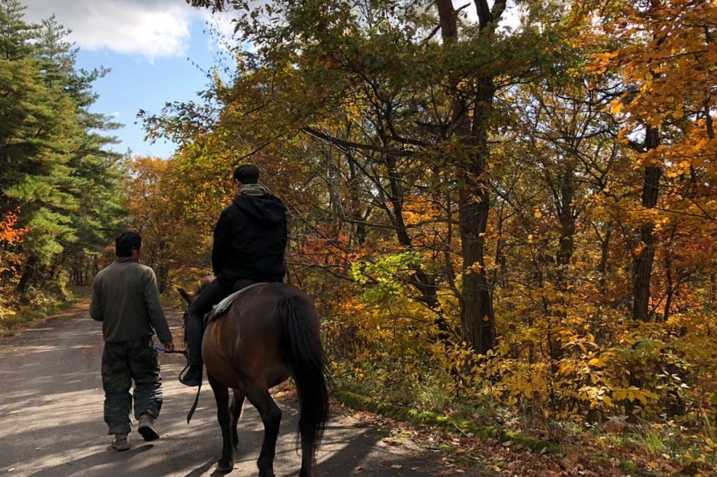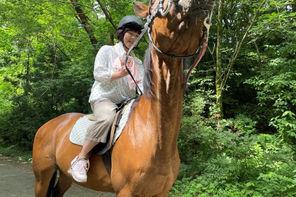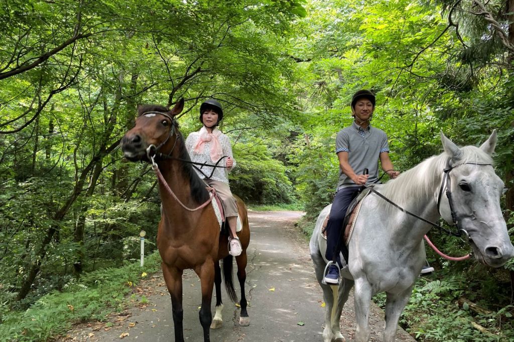 スタッフが同行する山道乗馬コースは乗馬未経験者でもおすすめのコース。馬に乗りながら、四季折々の森の様子を楽しめます。夏の山道乗馬コースは木漏れ日と新緑が心地よく、冬は美しい雪景色が見られ、寺泊の大自然を全身で味わえます。