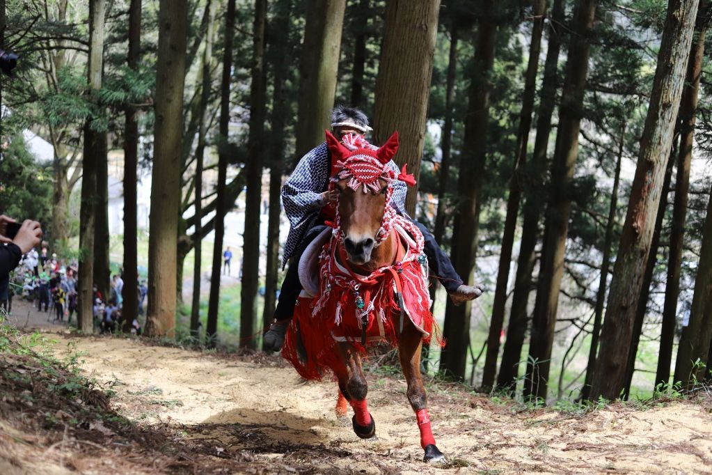 胎内市下赤谷にある鳥坂神社は、かつて「馬頭観音」と呼ばれ、牛馬の安全と五穀豊穣を祈る地域の信仰を集めてきました。農作業の始まりを告げる4月18日には、飾り馬を連れて参拝する伝統があり、鈴を響かせながら練り歩く「シャングシャング馬」は春の風物詩として多くの人で賑わったといいます。最盛期には数十頭もの馬が集い、土産物屋も並ぶにぎやかな祭礼でしたが、時代とともに一度は姿を消しました。しかし平成27年、地域の想いと松原ステーブルの協力により3頭の馬から復活。急斜面の参道を駆け上がる勇壮な姿は、今も訪れる人々に感動を与えています。また境内には胎内市の天然記念物である樅(もみ)の巨木や、精緻な彫刻が施された観音堂も残り、歴史と自然の息づく馬の聖地として親しまれています。